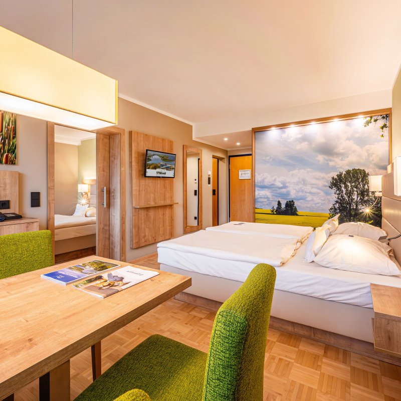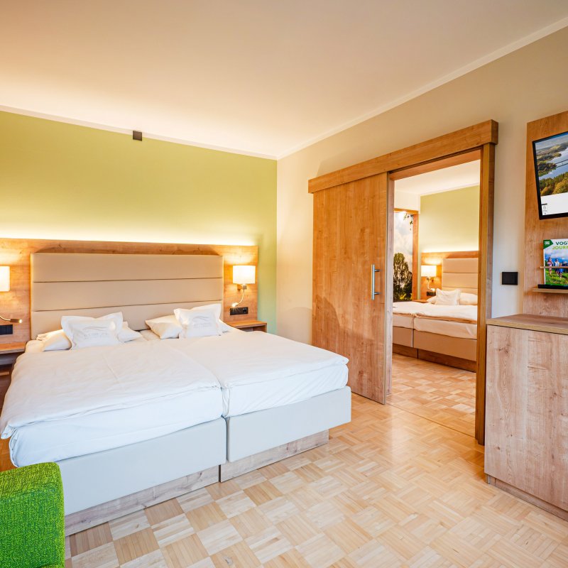 Wählen Sie aus unseren Kategorien Ihre Wohlfühloase für den Familienurlaub am Zeulenrodaer Meer. Alle Familienzimmer bestehen aus zwei getrennten Schlafräumen mit Verbindungstür, sind renoviert und nachhaltig gestaltet. Jeder Raum ist mit einem eigenen TV ausgestattet.
